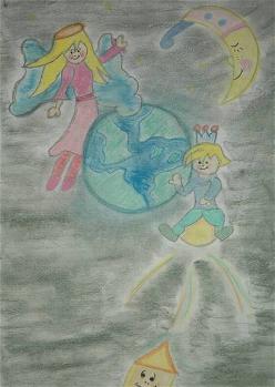 Es waren die beiden Raketen von Annika und Robin. Auf einmal gab es einen Knall und beide Raketen explodierten aus einander. Der Engel erschrak und duckte sich. Doch als er sich wieder aufrichtete traute er seinen Augen nicht. Durch die Explosion der beiden Raketen bildeten sich viele, ja unzählbare neue Sterne. Es war ein tolles Schauspiel am Himmel. Doch von dem Schrecken musste sich der Engel erst einmal erholen. So legte sie sich ein bisschen hin und schloss die Augen. Plötzlich hörte der Engel eine Stimme rufen. „Hallo Engel, bist du da?“. Was ist den das fragte sich der Engel und öffnete die Augen. Er drehte sich um und traute seinen Augen nicht. Es war ihr Prinz. Er sprang von Stern zu Stern, so wie es Kindern tun wenn sie von Stein zu Stein über einen Bach springen. Es waren die neuen Sterne die er dazu nutzte. So kam er immer näher und näher bis er schließlich mit einem riesen Satz auf den Stern des Engels sprang. Da stand er vor ihr. Ihr Prinz. Der Engel war völlig erstarrt. Der Prinz lächelte sie an und nahm den Engel wortlos in den Arm. Beide waren so glücklich das sie sich nun nach der langen Zeit endlich in den Arm nehmen konnten. Sie erlebten zusammen einfach wunderschöne Tage und Wochen.